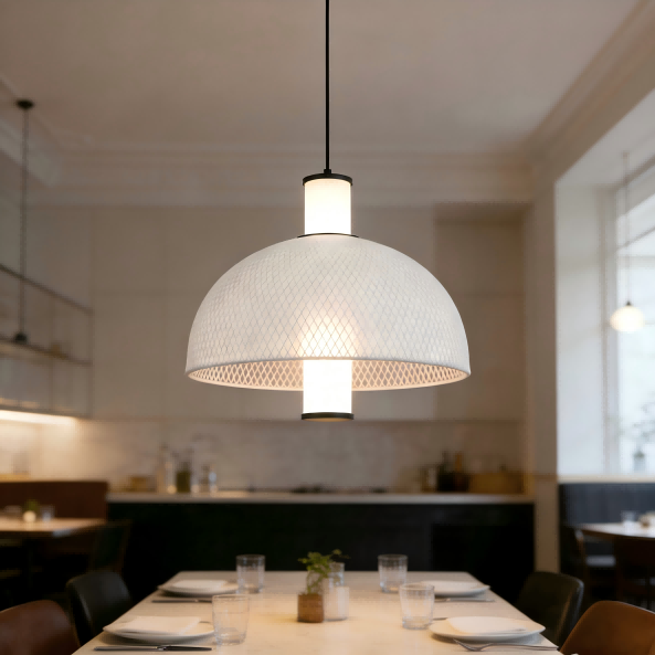 Incitatus ad incisurae designationis trends ad 2025 Mediolanensem Euroluce exhibitionem, haec reticula serica minimalis Italicae lucernae pendentis e Fortis Accensionis inconsutilis miscet minimismum Italicum cum practica functione. Centralis 15W DUCTUS lucis fontem emittit 4000K lucem neutram, quae atmosphaeram commodam creans. Splendor 1500LM et colore magno reddens indicem Ra>80, lux est naturalis et vera ad vitam, apta faciens ad conclavia, triclinia, et alia spatia. Lucernae arcus informis rotundus factus reticulum ferreum circumvolvit fabricae serica alba, et ferramenta matte nigra confecta cum imbre pingunt processum ut textura adderet. Simplex consilium facile in Nordic, modernum, aliosque stylos domesticos inseritur.
